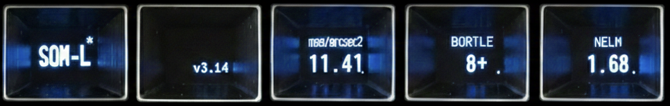 - Wyświetla wartość NELM (Naked Eye Limiting Magnitude – wskaźnik używany w astronomii, który określa maksymalną jasność najsłabszych gwiazd widocznych gołym okiem) podawaną w jednostkach mag (wartość teoretyczna)